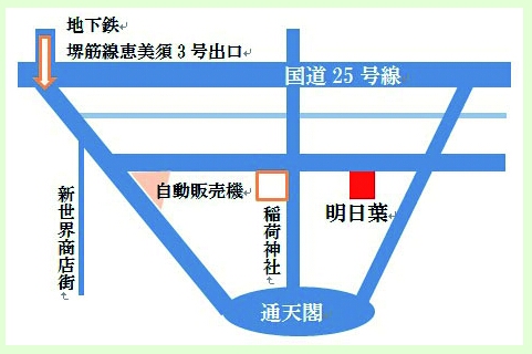 ・大阪市営地下鉄 堺筋線 恵美須町駅 3番出口(徒歩5分) ・阪堺電車 阪堺線 恵美須町駅(徒歩3分) ・大阪市営地下鉄 御堂筋線 動物園前駅 1番出口(徒歩10分) ・JR 環状線 新今宮駅 東出口(徒歩12分) ・南海電車 南海本線 新今宮駅 西出口(徒歩15分)